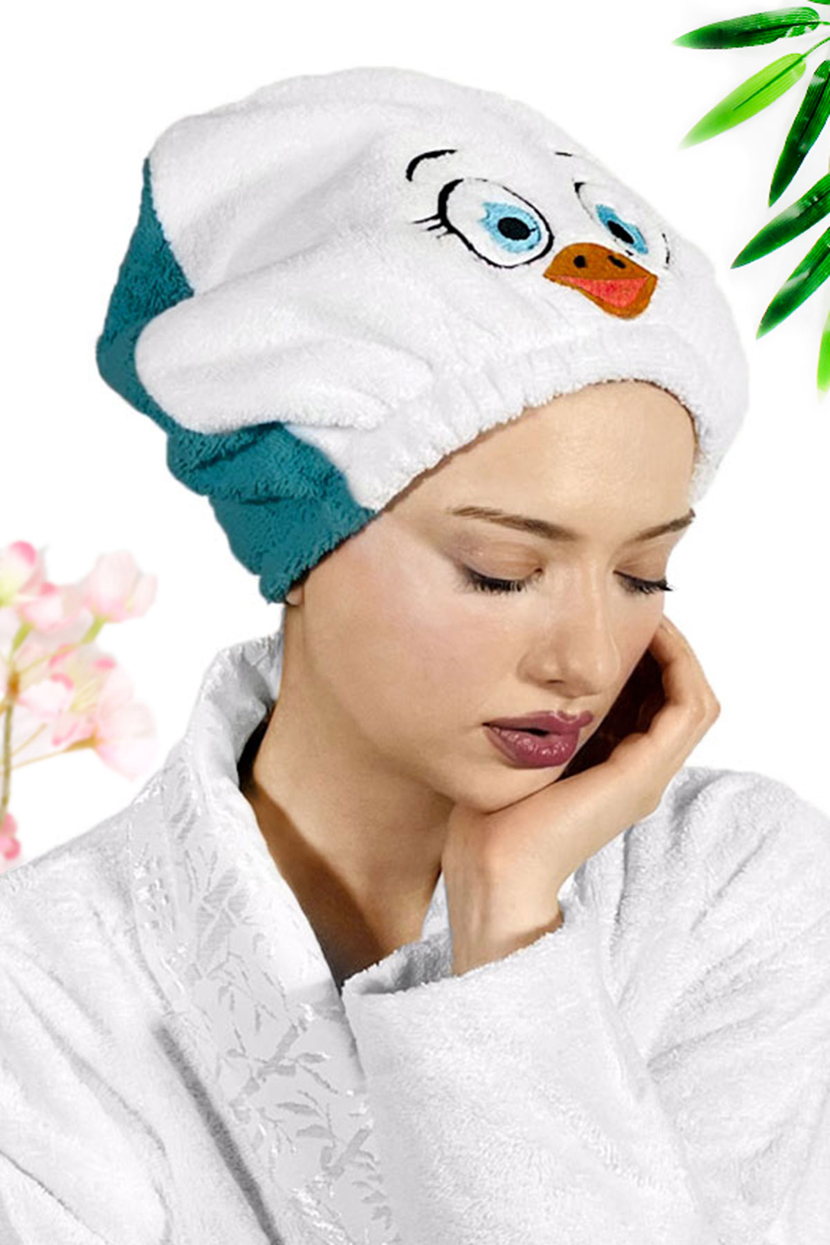 Kadın Kuş Desenli Petrol Yeşili Havlu Bone – Birinci Kalite Pamuk Dokuma